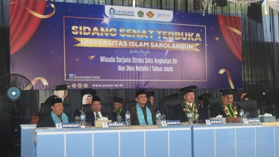 SPcom SAROLANGUN – Bupati Sarolangun Hurmin menghadiri langsung acara wisuda sarjana Strata-1 Universitas Islam Sarolangun (UNISAR) angkatan XV dan Dies Natalis I Tahun 2025 di Kampus UNISAR, Desa Tanjung, Sabtu (22/11/2025).