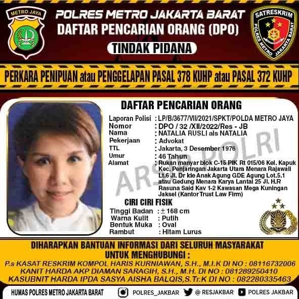 SPcom JAKARTA – Reskrim Polres Metro Jakarta Barat merilis daftar pencarian orang (DPO) atas penggelapan yang dilakukan oleh seorang Advokat bernama Natalia Rusli.