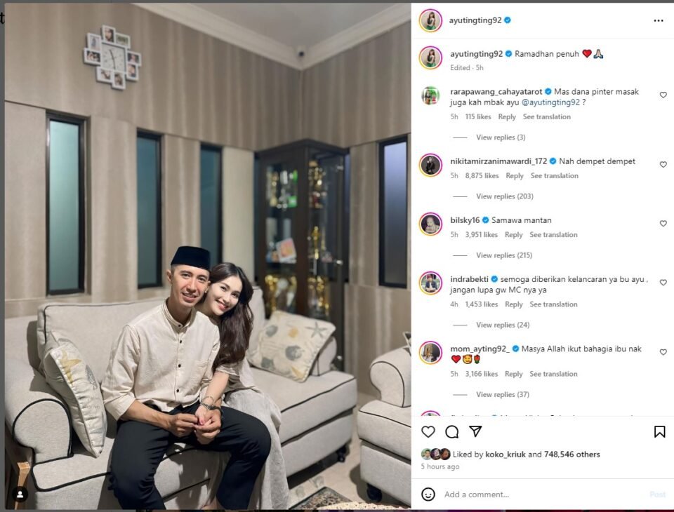 Yang membuat baper, duduk Ayu terlihat begitu rapat dengan calon suami, dan tangan mereka pun saling menggenggam. ‘Ramadan Penuh Cinta’, tulis Ayu dalam kepsen foto tersebut. Sontak unggahan ini banjir komentar, termasuk rekan-rekan sesama artis, seperti Nikita Mirzani dan juga Indra Bekti. “Nah dempet-dempet” tulis Nikita Mirzani. “Semoga diberi kelancaran ya bu Ayu…Jangan lupa gw MCnya ya,” ujar Inbek.