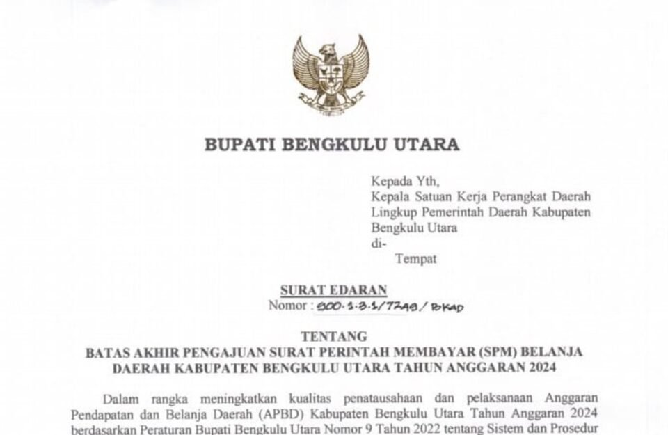 SPcom BENGKULU – Pemerintah Kabupaten Bengkulu Utara resmi mengeluarkan Surat Edaran Nomor 900/1.3.1/7249/BKAD tentang Batas Akhir Pengajuan Surat Perintah Membayar (SPM) Belanja Daerah Tahun Anggaran 2024.