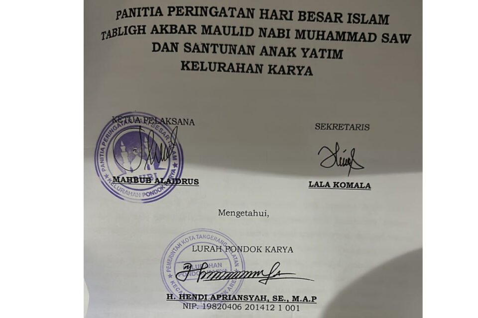 SPcom TANGSEL – Beredar surat permohonan dana untuk kegiatan Tablig Akbar Maulid Nabi dan Santunan yang ditandatangani Lurah Pondok Karya, Hendi Apriansyah.