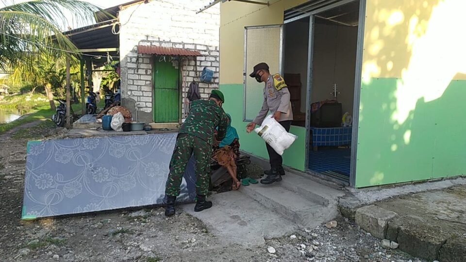 SPcom GRESIK – Bhabinkamtibmas dan Babinsa Desa Sembayat bergandengan tangan mendatangi Ibu Maruji (80), yang hidup sebatang kara di RT 19/04.