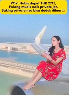SPcom JAKARTA – Artis Bunga Zainal baru – baru ini menghebohkan warganet lewat unggahan videonya di media sosial. Dalam video tersebut, Bunga memparodikan dirinya pulang mudik dengan menggunakan Private Jet, setelah menerima uang THR sebesar 271 Triliun. Samun saking Privatenya, ia sampai duduk di luar pesawat, hingga akhirnya membuat tidak sedikit warganet terhibur dengan aksinya.