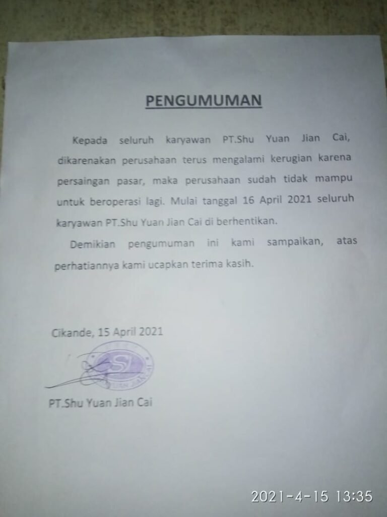 Pihak perusahaan berlasan terus mengalami kerugian karena persaingan pasar, maka perusahaan sudah tidak mampu untuk beroperasi lagi. Maka tanggal 16 April 2021 seluruh karyawan PT. Shu Yuan Jian Cai diberhentikan.