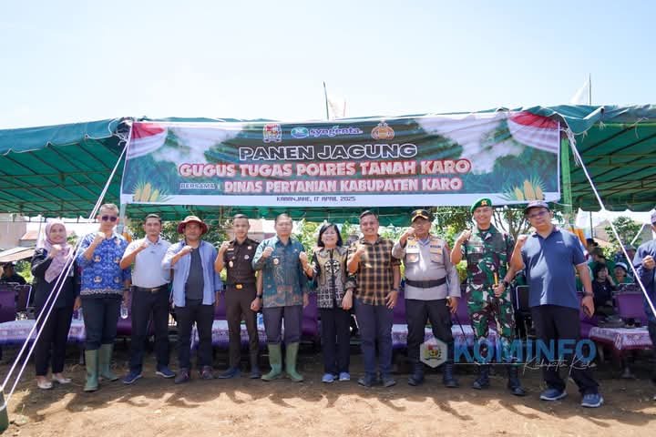 SPcom KARO – Wakil Bupati Karo, Komando Tarigan, bersama jajaran Forkopimda Kabupaten Karo melaksanakan panen jagung, di Lau Pinggan, Kelurahan Gung Negeri, Kaban Jahe, Kamis (17/4/2025).