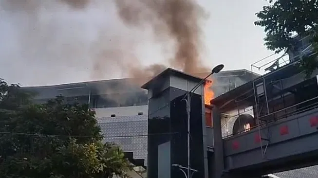 Tampak lift lantai dua JPO itu terbakar. Bahkan kobaran api tersebut sampai tersebar ke bawah lift.