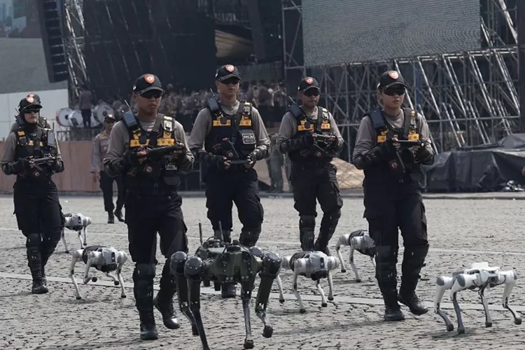 SPcom JAKARTA – Dalam rangka Hari Bhayangkara ke-79, Polri memamerkan kecanggihan robot anjing pelacak atau dog K9 beratribut Polri untuk mendeteksi bom di hadapan Presiden Prabowo Subianto saat Upacara Hari Bhayangkara ke-79 di Lapangan Monas, Jakarta Pusat, Selasa (1/7/2025).