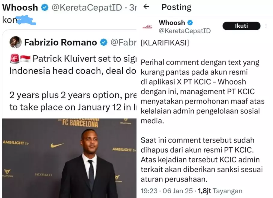 SPcom JAKARTA – Operator Whoosh, PT Kereta Cepat Indonesia-China (KCIC), memberikan sanksi kepada admin akun media sosial mereka di X usai menulis komentar tak pantas soal pelatih baru timnas sepak bola menggantikan Shin Tae Yong, Patrick Kluivert.