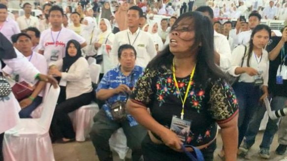 Tak hanya berusaha menerobos dan menyiram air, wanita itu juga tampak membuka sendalnya. Dan berusaha melemparkannya ke arah panggung. Seakan-akan ingin mencuri perhatian.