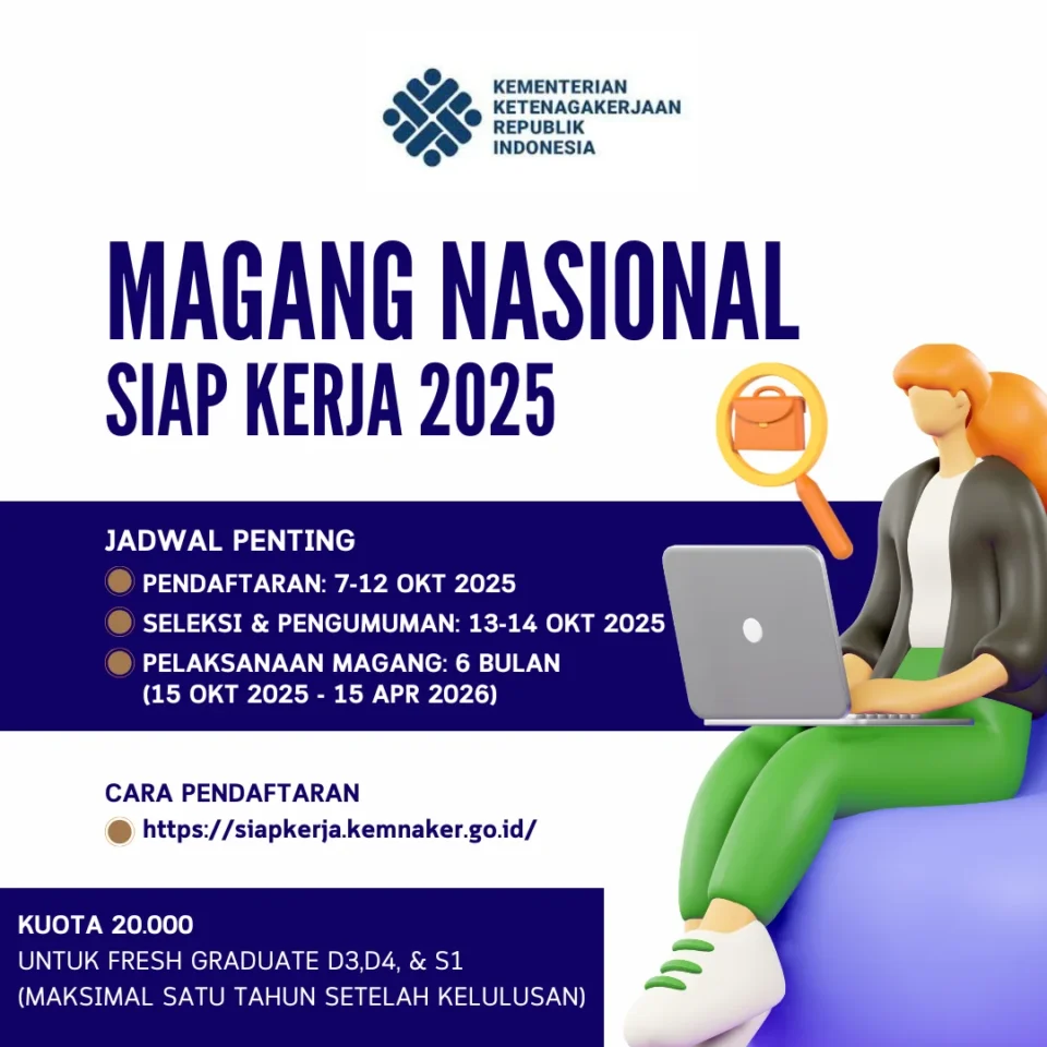 syaratnya pun cukup mudah: Warga Negara Indonesia (WNI) dengan NIK aktif. Lulusan Diploma atau Sarjana dengan masa kelulusan maksimal 1 tahun. Berasal dari perguruan tinggi terdaftar di Kemendikbudristek. Pendaftaran sepenuhnya dilakukan online! Kunjungi langsung maganghub.kemnaker.go.id dan lengkapi biodata Anda di siapkerja.kemnaker.go.id.