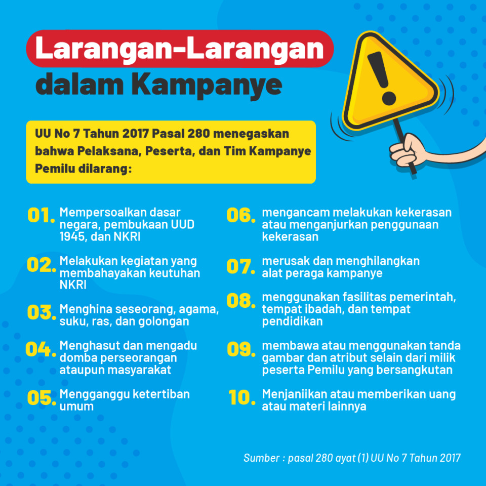 Ada sejumlah aturan dan dan larangan yang harus diperhatikan peserta Pemilu, baik partai politik, calon anggota dewan, dan pasangan capres-cawapres saat masa Kampanye Pemilu 2024.