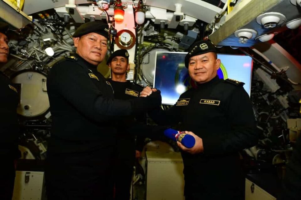 SPcom JAKARTA – Kepala Staf TNI AD (KASAD) Jenderal TNI Dr. Dudung Abdurachman diangkat menjadi warga kehormatan kapal selam TNI Angkatan Laut sekaligus menerima brevet kehormatan Hiu Kencana yang disematkan langsung oleh Kepala Staf Angkatan Laut (Kasal) Laksamana TNI Yudo Margono di dalam kapal selam New KRI Alugoro-405, Jakarta, Senin (28/11/2022).