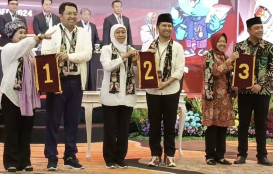 SPcom JATIM – Komisi Pemilihan Umum (KPU) Jawa Timur (Jatim) menetapkan nomor urut pasangan calon peserta Pilkada Jatim 2024. Pasangan Luluk Nur Hamidah-Lukmanul Khakim mendapat nomor urut 1, pasangan Khofifah Indar Parawansa-Emil Elestianto Dardak di nomor urut 2 dan Tri Rismaharini-KH Zahrul Azhar Asumta atau Gus Hans nomor urut 3.