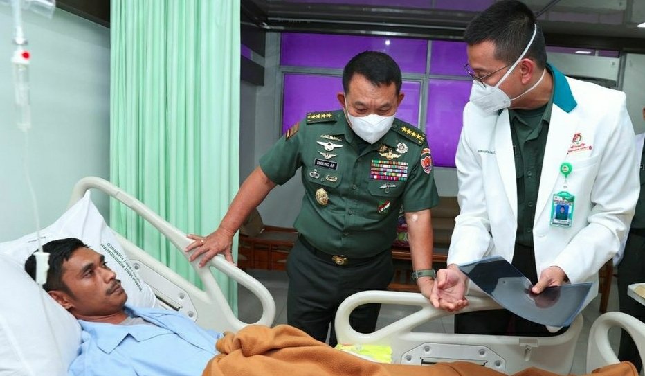 SPcom JAKARTA – Kepala Staf Angkatan Darat (KSAD) Jenderal TNI Dudung Abdurachman, menjenguk Sertu Robi Sohoka, prajurit TNI AD serta Dandim 1715/Yahukimo Letkol Inf J.V Tethool yang terluka akibat penyerangan KKB di Yahukimo Papua dalam perawatan RSPAD Gatot Soebroto, Jakarta, Kamis (16/3/2023).
