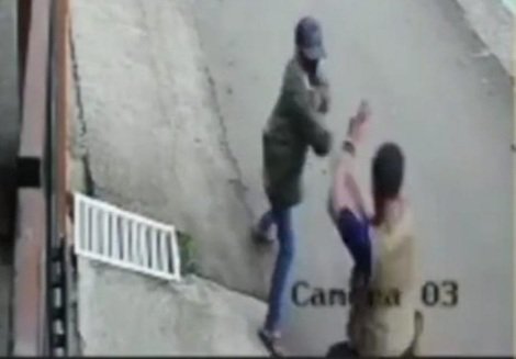 Begitu satpam semakin mendekat, pelaku membacok tangan korban. Tampak satpam yang membawa tongkat mencoba memukul pelaku.