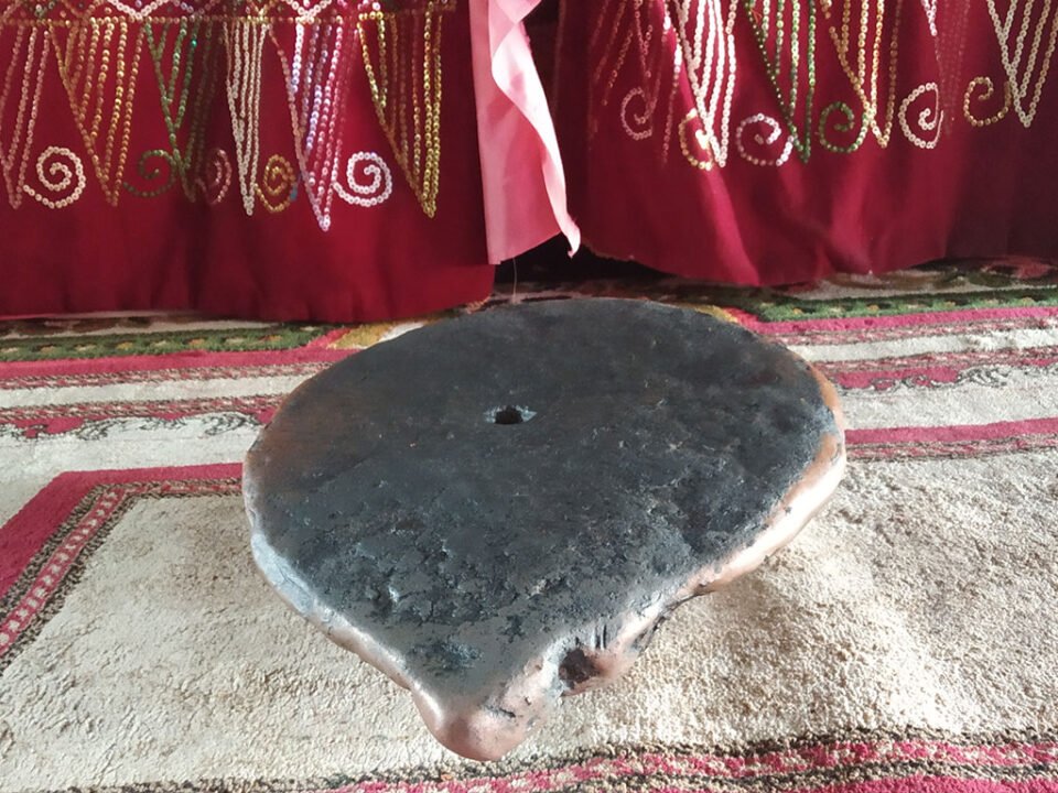 “Awalnya dempet dua seperti jengkol. Ini kira-kira kupasan Jengkol bagian atas. Ini tengahnya. Berarti ada satu keping lagi, yang satu keping lagi dari dulu ga pernah bisa diambil. Di batu ada ukiran menyerupai kalimat Allah dan ini agak lebih mirip, Muhammad. Dari pertama ditemukan kita tidak pernah ukir, sudah seperti ini,” kata Adi.