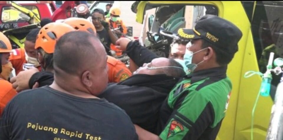 Namun nahas, satu penumpang yang duduk tepat di samping sopir tak bisa langsung dievakuasi petugas lantaran tubuhnya terjepit bodi kendaraan yang ringsek.