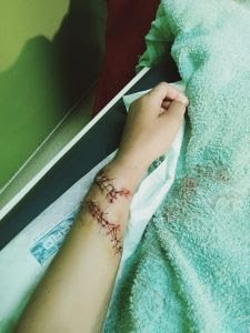 Lukanya cukup parah, hingga kena pembuluh darah. “Pembuluh darahnya diiket dan dijait luarnya. Yang bawah 7 jahitan yang atas 9 jahitan, yang tangan kanan ada 7 jahtan juga,” ucapnya.