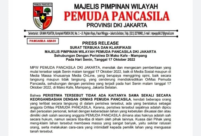 Rilis yang ditandatangani oleh Ketua MPW PP DKI Jakarta Ilyas Abdullah itu juga meminta media-media menghentikan pemberitaan yang mengaitkan peristiwa itu dengan Pemuda Pancasila.