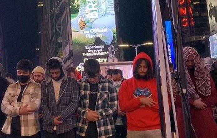 Berlatar belakang layar iklan led raksasa yang menjadi ikon kawasan paling ramai di New York itu, lebih dari 100 umat muslim mengikuti sholat Taraweh perdana dengan khusyu, meski kondisi cuaca sangat dingin, mencapai 4 derajat celcius.