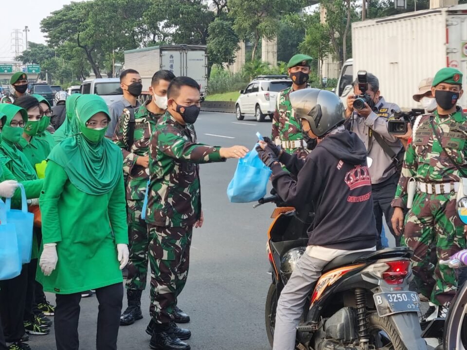 SPcom JAKARTA – Panglima Kodam Jaya, Mayjen TNI Dudung Abdurachman bersama jajarannya membagikan paket takjil untuk pengguna Jalan Mayjen Sutoyo, Jakarta Timur, Senin (10/5/2021).