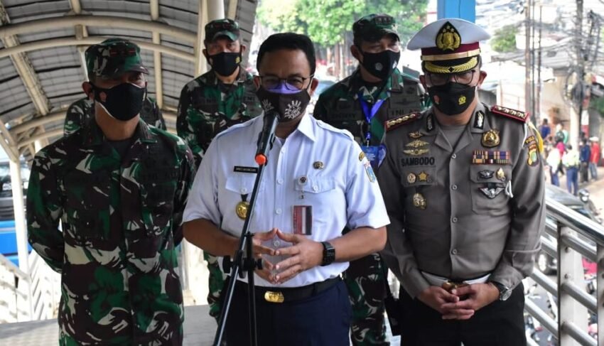 SPcom JAKARTA – Pangdam Jaya Mayjen TNI Mulyo Aji bersama Gubernur DKI Jakarta Anies Baswedan meninjau penyekatan terkait PPKM Darurat di Kawasan Mampang, Jakarta Selatan, Kamis (15/7/2021).