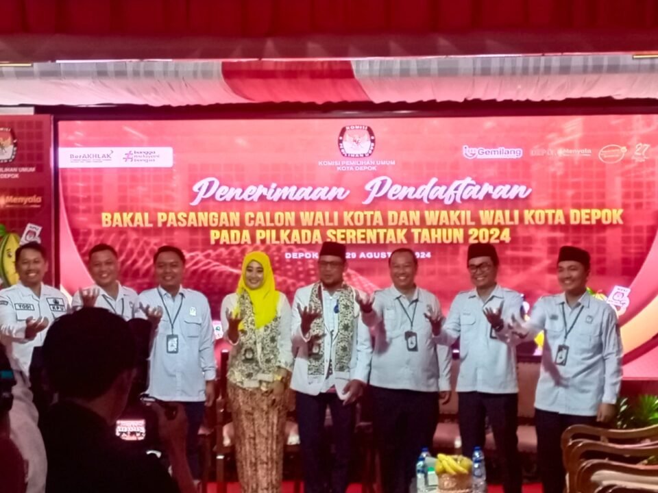 SPcom DEPOK. – Pasangan Bakal Calon (Bacalon) Wali Kota dan Wakil Wali Kota Depok, Imam Budi Hartono dan Ririn Farabi Arafiq, resmi mendaftar ke Komisi Pemilihan Umum (KPU) Kota Depok, Kamis (29/8/2024).
