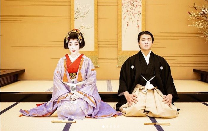 Dalam unggahan Instagram-nya, Syahrini berdandan ala Geisha dan duduk bersanding dengan Reino Barack. Tampilan Syahrini pun nyaris tak dikenali. Penyanyi yag acap disapa Princess itupun mengucapkan kata-kata romantis untuk sang suami.