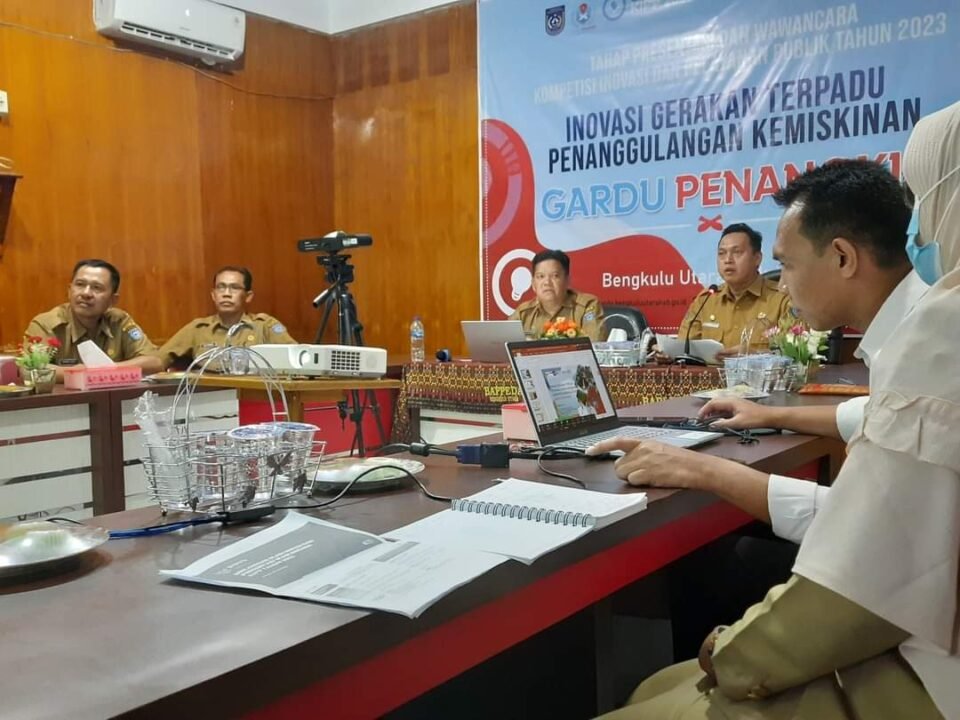 SPcom BENGKULU – Dalam rangka penilaian inovasi dan pelayanan publik tahun 2023 oleh Kementerian Pendayagunaan Aparatur Negara dan Reformasi Birokrasi (PANRB), Pemerintah Kabupaten (Pemkab) Bengkulu Utara (BU) melaksanakan tahapan presentasi dan wawancara, di ruang rapat Bappelitbangda Kabupaten BU, Selasa (4/7/2023).