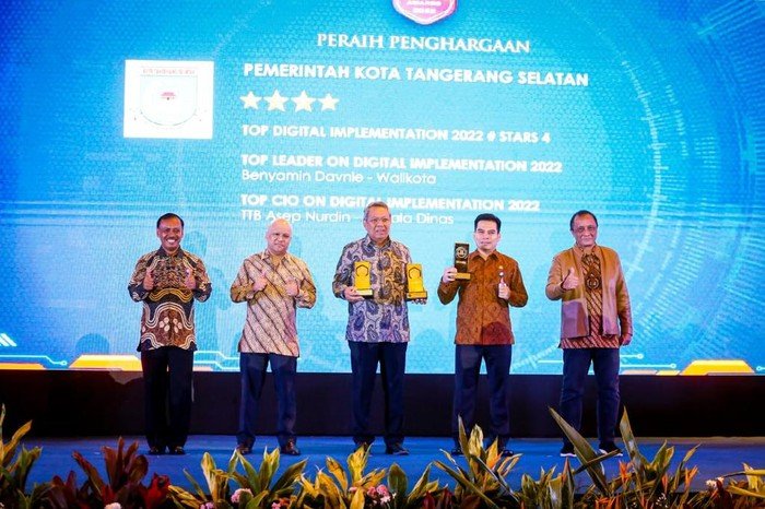 Ketiga penghargaan tersebut adalah ‘Top Digital Implementation 2022’ dengan level empat star untuk Pemkot Tangsel dan ‘Top Leader on Digital Implementation 2022’ untuk Walkot Tangsel Benyamin Davnie.