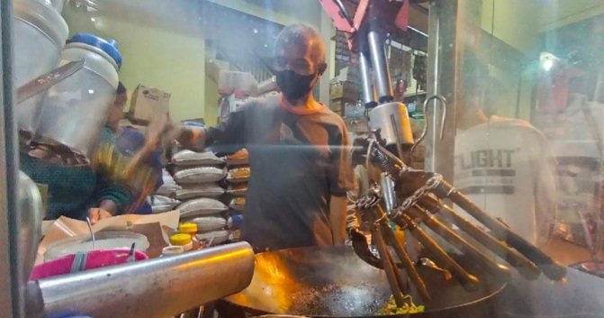 SPcom MALANG – Seorang penjual nasi goreng bernama Dartadi (60) memasak nasi goreng dengan cara berbeda. Ia dibantu alat atau robot saat mengolah nasi di atas wajan.