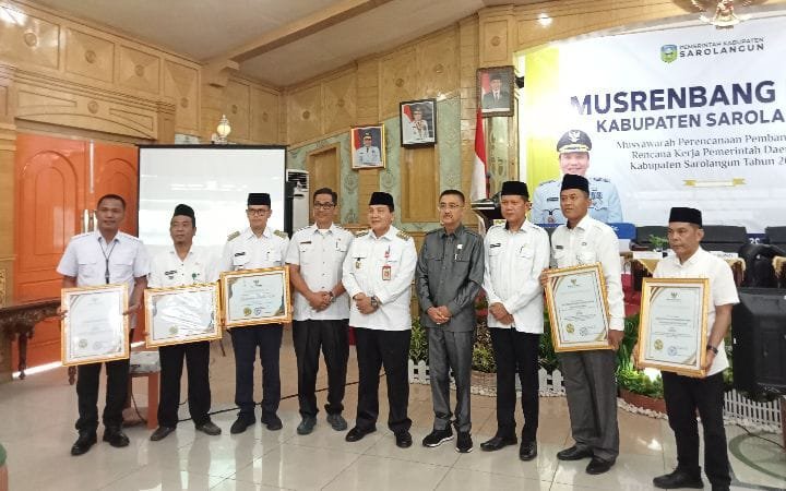 Dalam kegiatan tersebut juga dilakukan penyerahan piagam penghargaan kepada pelaksana Musrenbang kecamatan terbaik dan pelaksana inovasi daerah terbaik. Selain itu ada dialog interaktif serta penandatangan berita acara kesepakatan bersama dalam Musrenbang RKPD Kabupaten Sarolangun tahun 2025.(Adv/AR)