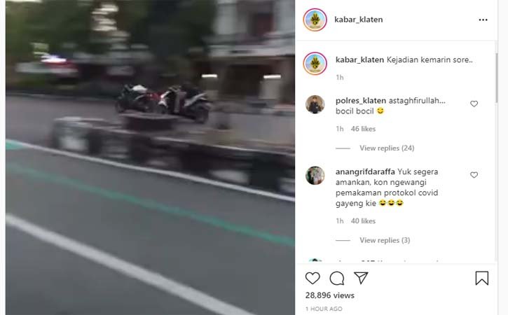 SPcom KLATEN – Aksi dua pemuda di Klaten yang lakukan balap liar beradu cepat dengan mobil ambulans viral saat diunggah di akun Instagram Klaten_24jam sekitar pukul 22.00 WIB. Pelaku balap liar tersebut nekat padahal dua ambulans menyalakan rotator dan sirine berbunyi keras saat melaju.
