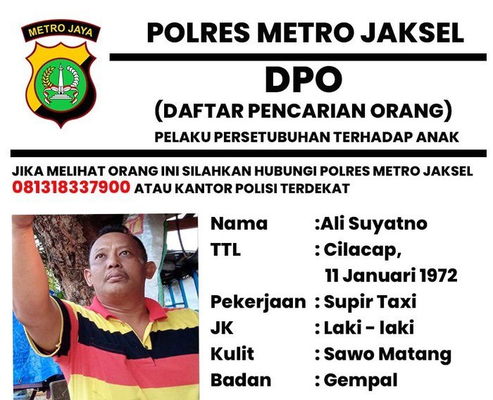 Berdasarkan gambar penerbitan DPO terduga pelaku yang dirilis oleh Unit PPA Stareskrim Polres Jakarta Selatan, tampak terduga pelaku bernama Ali Suyatno yang lahir di kawasan Cilacap tanggal 11 Januari 1972. Disebutkan kalau pelaku berprofesi sebagai sopir taksi.