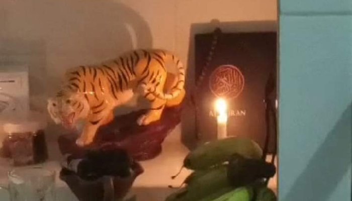 Dalam video yang viral itu, tampak Al-Qur’an diletakkan pada posisi berdiri di tempat sesajen. Ada pisang, bunga, tasbih, patung harimau, dan benda lainnya di dekat kitab suci itu.