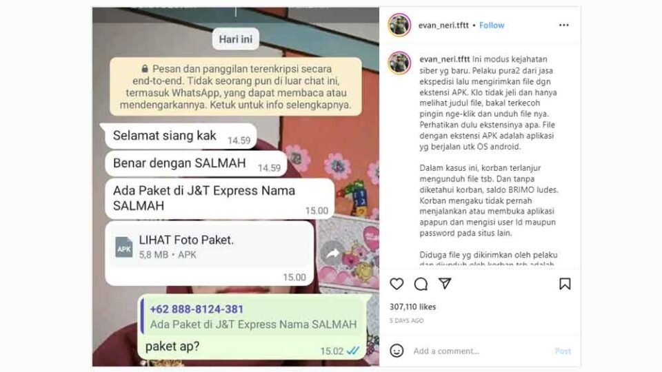 “Pelaku pura-pura dari jasa ekspedisi apapun lalu mengirimkan file dengan ekstensi APK (aplikasi),” tulis keterangan unggahan @polrespasuruanofficial.