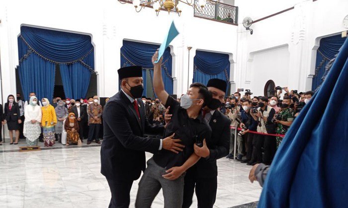Pria berkemeja hitam itu nekat masuk ke ruangan pelantikan di aula barat Gedung Sate, Kota Bandung, Senin (18/4/2022). Dia masuk ke ruangan pelantikan usai Gubernur Jawa Barat Ridwan Kamil memberikan sambutan.