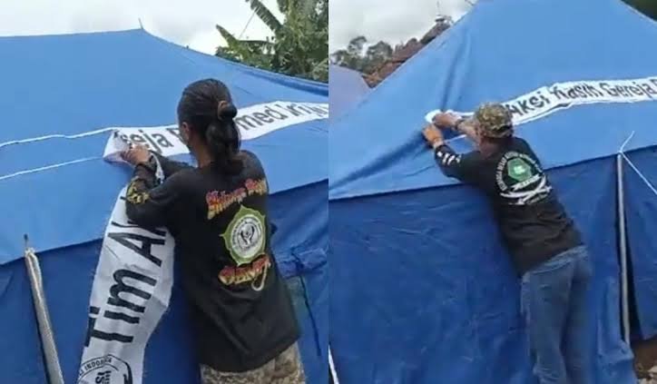 SPcom CIANJUR – Aksi pencopotan label gereja pada tenda bantuan untuk korban gempa Cianjur yang dilakukan organisasi masyarakat (ormas) viral di media sosial. Label itu dicopot tetapi bantuan tidak ditolak ormas.