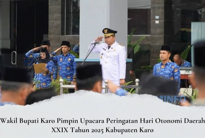 SPcom KARO – Wakil Bupati Karo, Komando Tarigan, memimpin upacara peringatan Hari Otonomi Daerah (Otoda) ke-29 di halaman Kantor Bupati Karo, Jalan Letjen Jamin Ginting, Kabanjahe, Jumat (25/4).